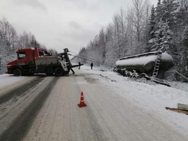Установлено, что грузовик «Ман» с прицепом не справился с управлением на скользкой трассе и опрокинулся к кювет по ходу движения.